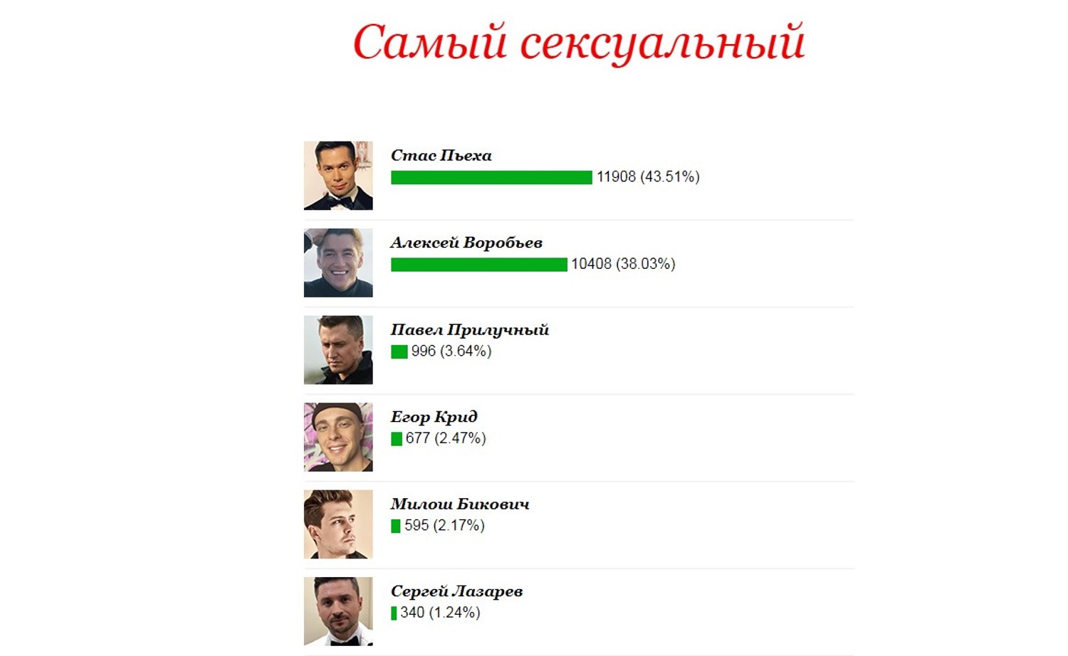 А победил в этой категории победил Стас Пьеха. Свою симпатию артисту выразили 43,51 % читателей "Комсомольской правды". Певец такому результату весьма удивился. Тем не менее, артист от души поблагодарил своих поклонников, которые так активно за него голосовали.